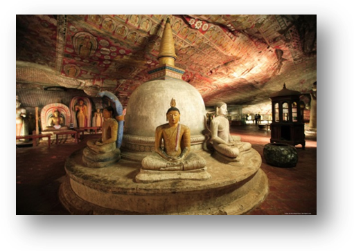 Like Sigiriya, Dambulla is a vast isolated rock mass and it was here that king Valagam Bahu took refuge from invasions in the 1st century B.C., later turning the caves into a rock temple. Some of its frescoes are over 2000 years old. Another highlight is a colossal figure of the recumbent Buddha carved out of the living rock, some 15 meters long. The caves have a mixture of religious and secular paintings and sculptures with ceiling frescoes depicting scenes from the Buddha’s life and Sinhalese history.