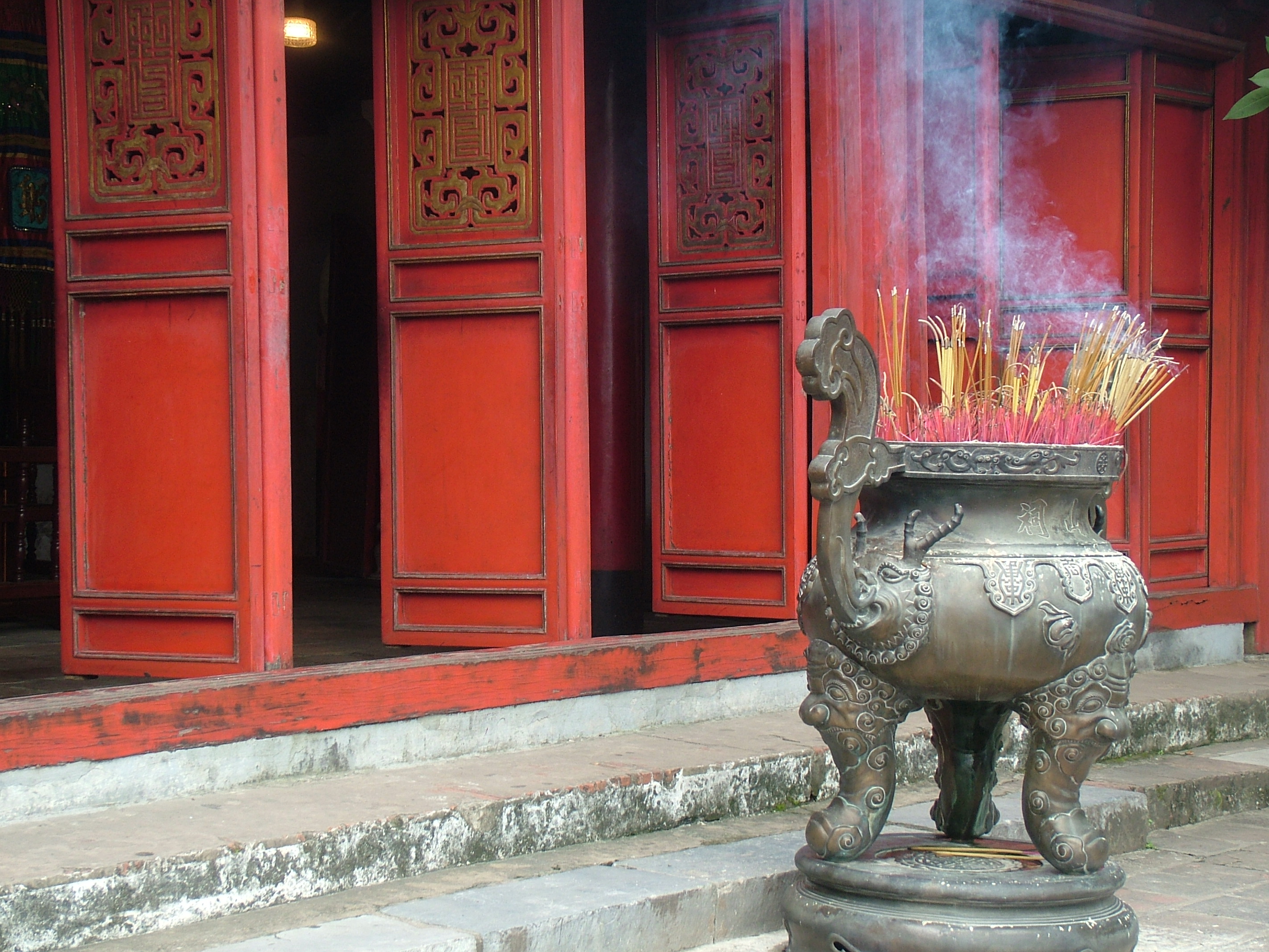 young professionals zip by on motorbikes, chatting on cell phones; inside the quiet temple